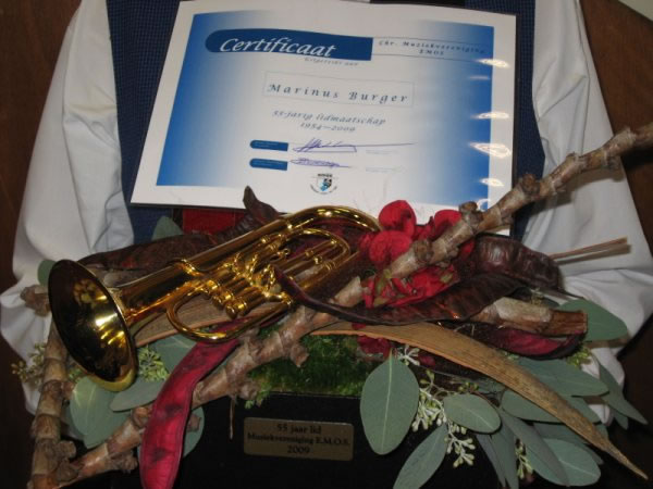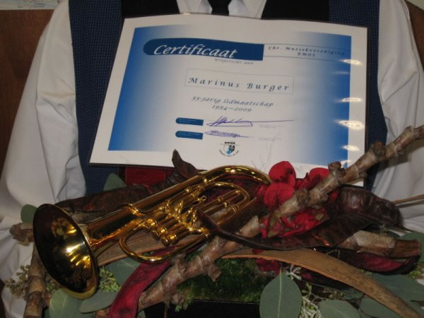 Tijdens het concert van vrijdag 11 december 2009 werd Marinus Burger gehuldigd; hij is al 55 jaar lid van EMOS!